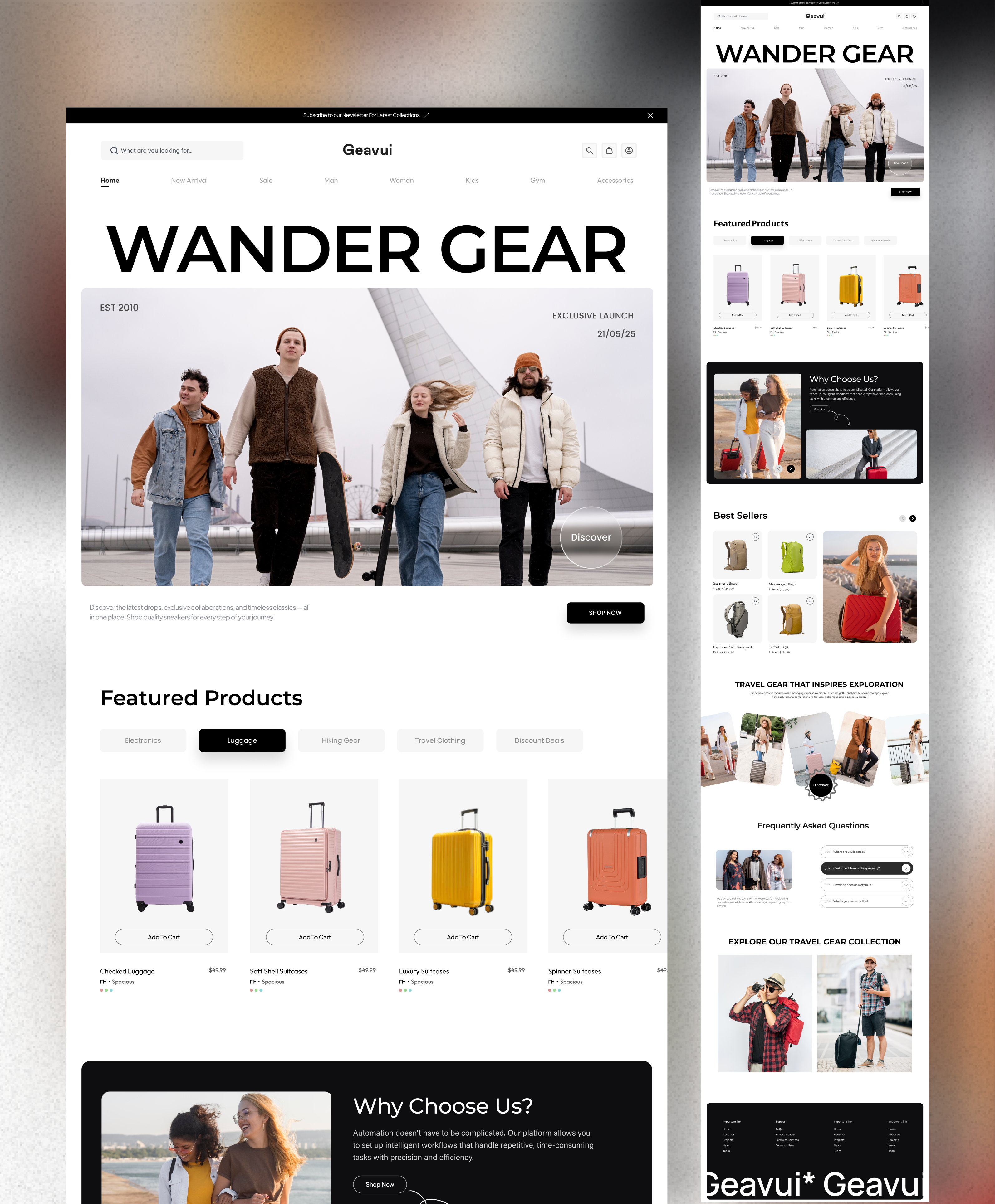 This tourism gear ecommerce website template is designed to help you create a beautiful online presence for your tourism gear business. The layout includes everything you need to showcase your products, share your story, and connect with customers. Each section has been carefully designed with warm colors and appetizing imagery that makes your baked goods look irresistible. The template works great for any bakery, patisserie, or dessert shop looking to establish their brand online.